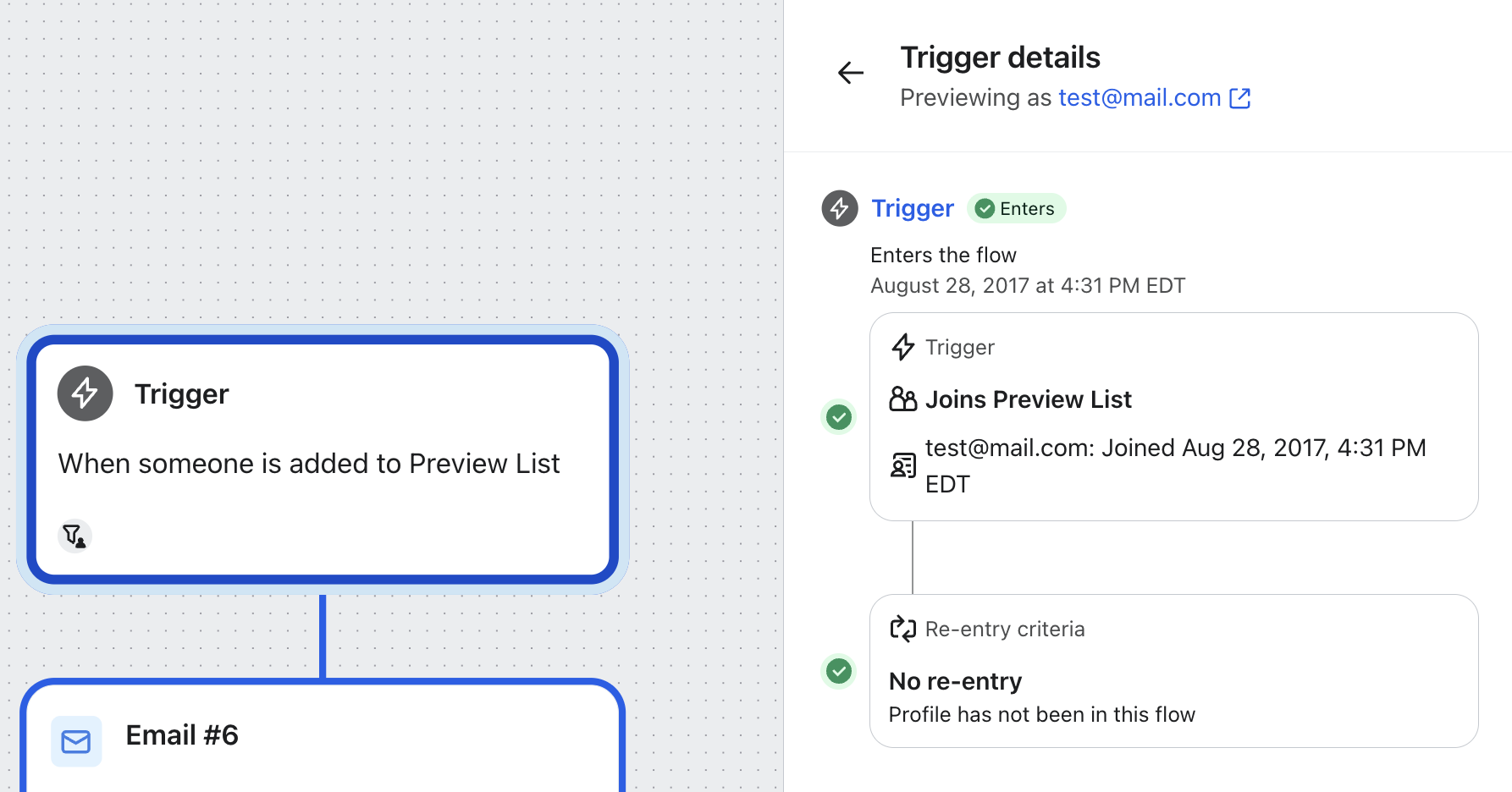 Ponieważ narzędzie podglądu konfiguracji wyzwalacza sprawdza tylko sam wyzwalacz, nie weźmie pod uwagę żadnej dodatkowej sekwencji lub podziału wyzwalacza w twojej sekwencji, ani filtrów dodanych do twoich wiadomości, ponieważ nie określają one, czy ktoś kwalifikuje się do wejścia do sekwencji.