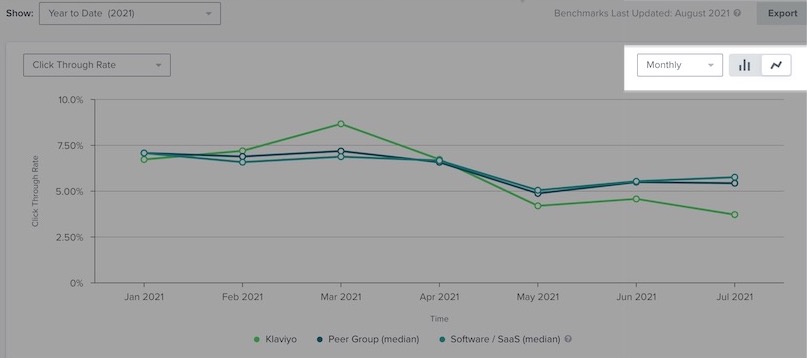 Zauważ, że Klaviyo testy porównawcze obecnie konto dla e-mail dane i nie obejmują SMS dane.