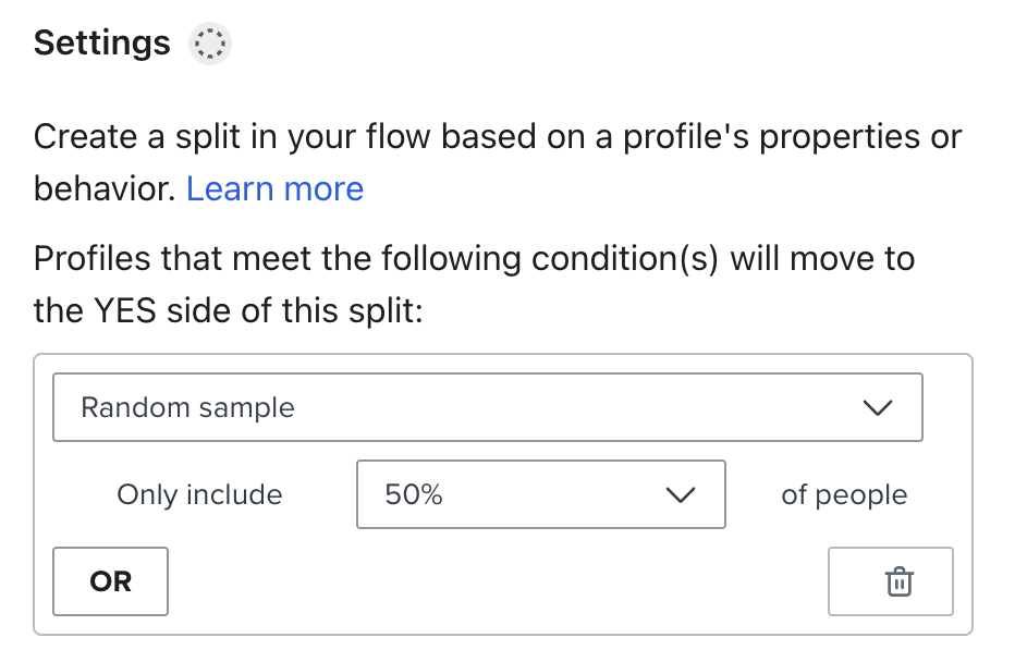 - Proszę skonfigurować podział na podstawie próby losowej 50%. Umożliwi to przeprowadzenie testu A/B czasu jednej z wiadomości.