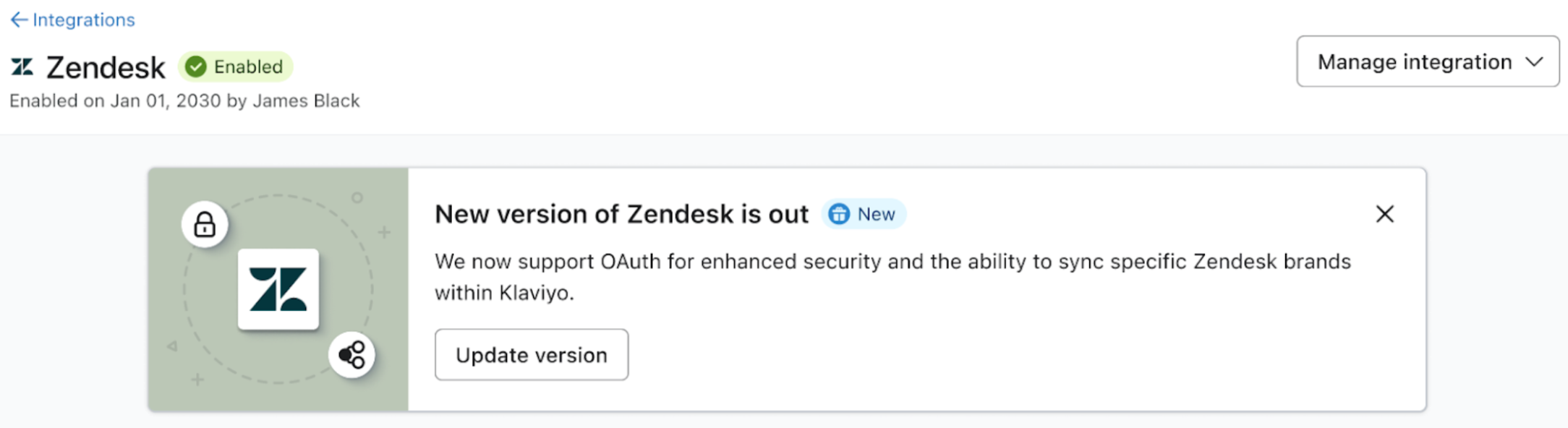 Dowiedz się, jak zaktualizować swoje integracje Zendesk, jeśli zintegrowałeś Klaviyo i Zendesk, zanim Klaviyo wprowadził OAuth dla Zendesk i pomoc dla wielu marek Zendesk. Ważna jest aktualizacja, aby uzyskać korzyści z nowych integracji, a tylko nasze nowe integracje będą aktualizowane w przyszłości.