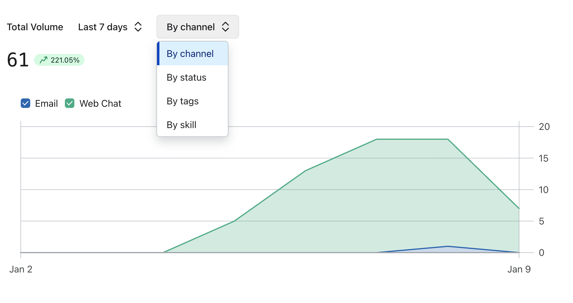Proszę użyć selektora kanałów, aby wybrać sposób grupowania danych na wykresie. Mogą Państwo wybrać pogrupowanie danych na wykresie słupkowym według: kanału, statusu lub znacznika.