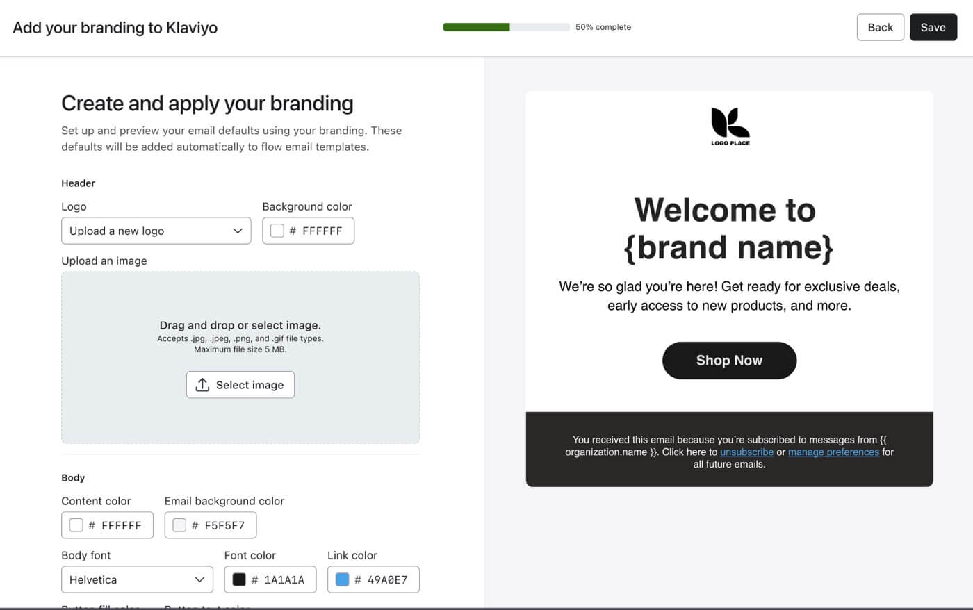 - Skonfiguruj branding dla swoich szablonów e-mailowych. Nagłówek, stopka i treść zostaną automatycznie wypełnione elementami z poprzedniego kroku, ale możesz je ręcznie zmienić według własnego uznania.