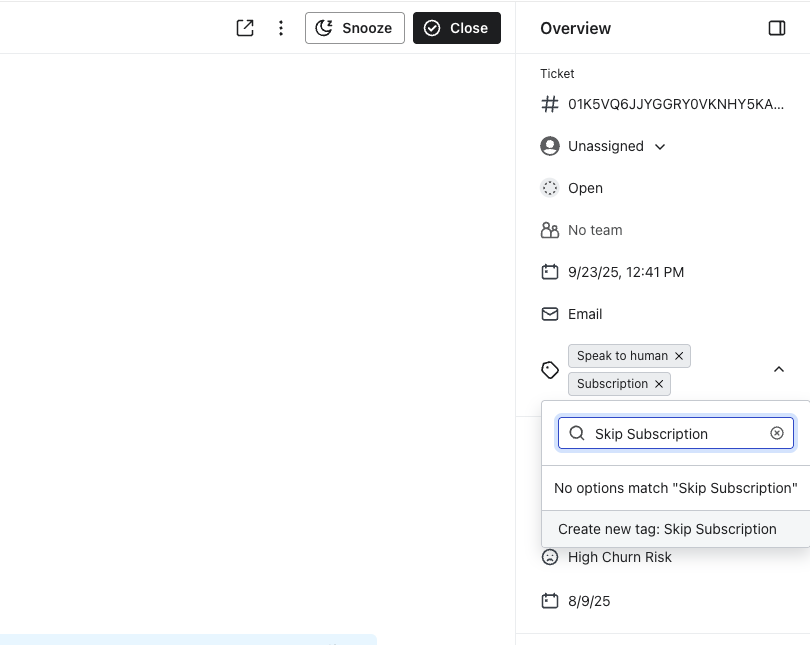 Automatycznego znacznika nie można wyłączyć, ale po dodaniu możesz go usunąć w razie potrzeby. Gdy zgłoszenie zostanie automatycznie oznaczone, w menu rozwijanym znaczników w zgłoszeniu będą widoczne tylko określone, predefiniowane znaczniki dodane przez Klaviyo, wraz z wszelkimi niestandardowymi znacznikami, które utworzyłeś. Pełna lista predefiniowanych znaczników nie jest wyświetlana jako opcje w menu rozwijanym.