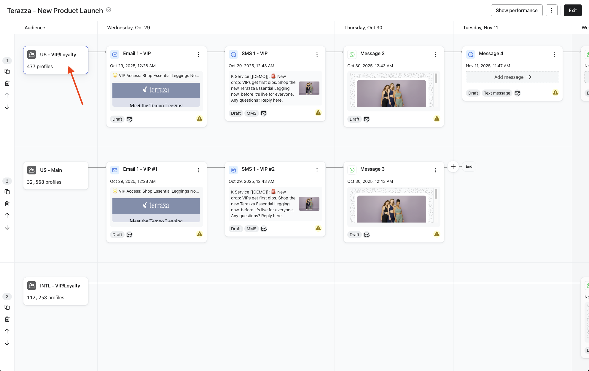 Kryteria wyjścia pomagają zapobiegać nadmiernemu wysyłaniu wiadomości, automatycznie usuwając klientów z wielodniowych kampanii omnikanałowych, takich jak obniżki cen produktów, wyprzedaże błyskawiczne i akcje lojalnościowe, po spełnieniu przez nich zdefiniowanych warunków konwersji. Gwarantuje to, że przekonwertowani klienci nie otrzymują już wiadomości promocyjnych, tworząc płynniejsze doświadczenie i poprawiając ogólną wydajność kampanii.