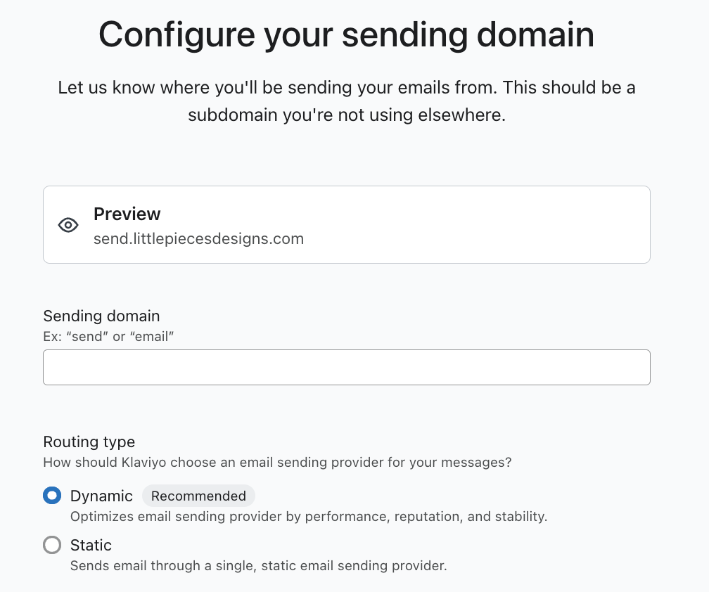 Ao configurar seu domínio de envio da marca, você pode delegar seu subdomínio à Klaviyo para podermos selecionar dinamicamente a melhor opção de provedor de envio.