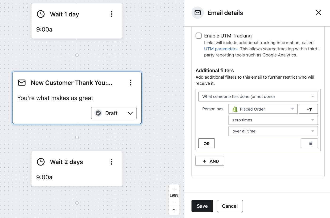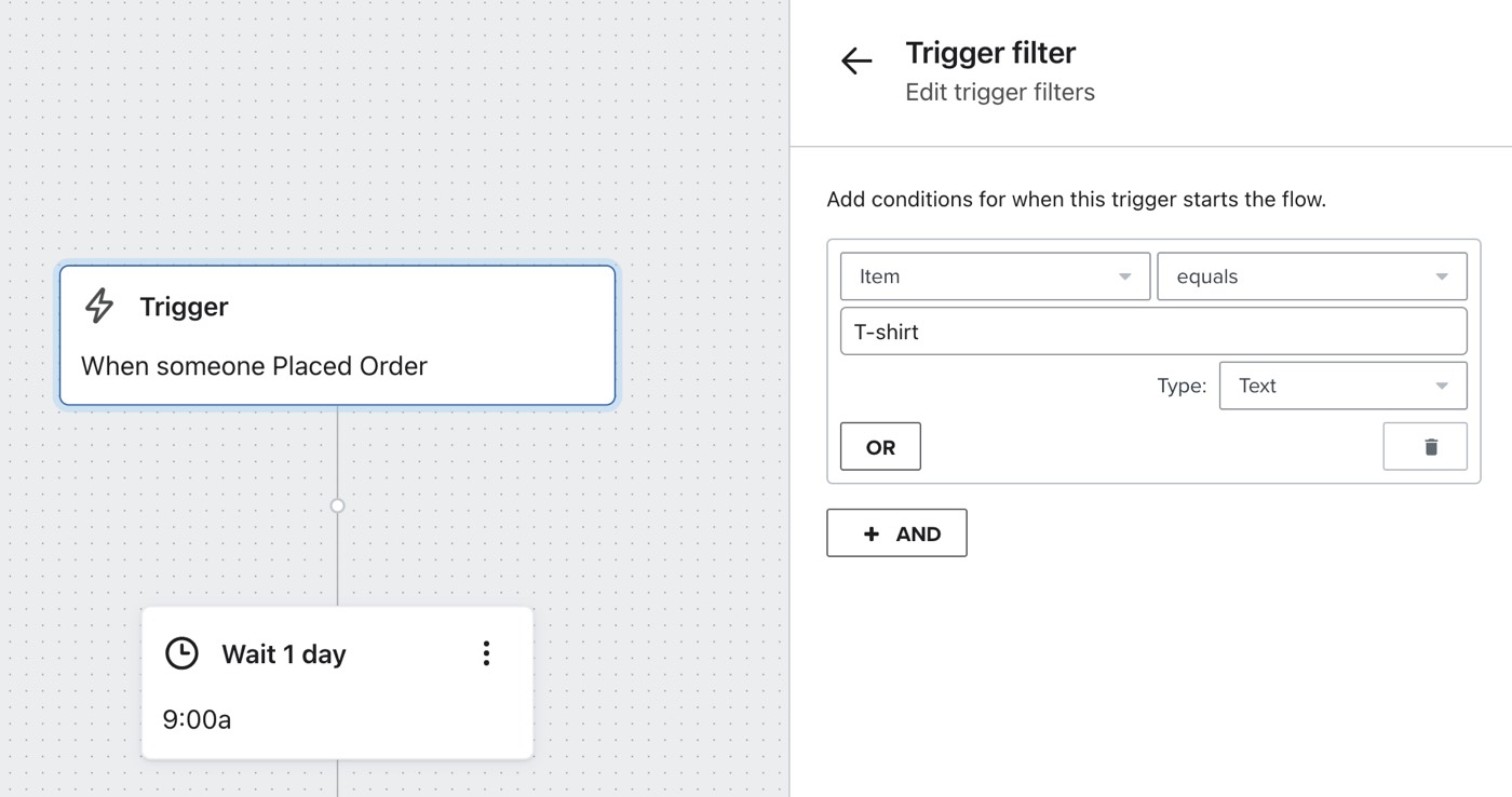 Alguns itens que você vende podem exigir algumas instruções de como fazer ou justificar uma mensagem pós-compra direcionada. Para um fluxo disparador pela sua métrica de Pedidos feitos, use um filtro disparador para direcionar a compra de apenas um item específico e dar a esses clientes o acompanhamento personalizado de que eles precisam.