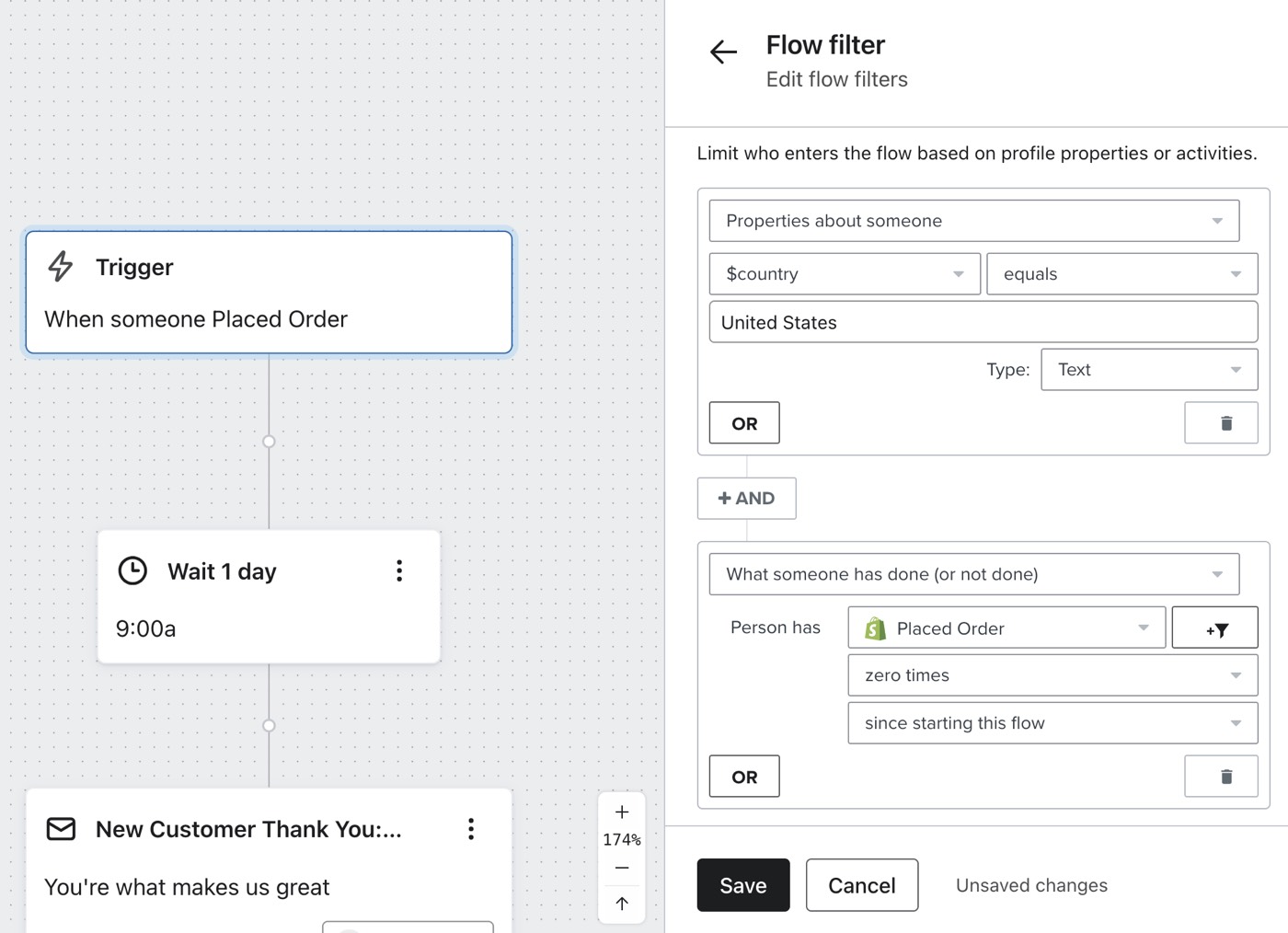 O exemplo abaixo demonstra um fluxo que enviaria apenas para pessoas que não fizeram um pedido desde o início do fluxo e que moram nos Estados Unidos.