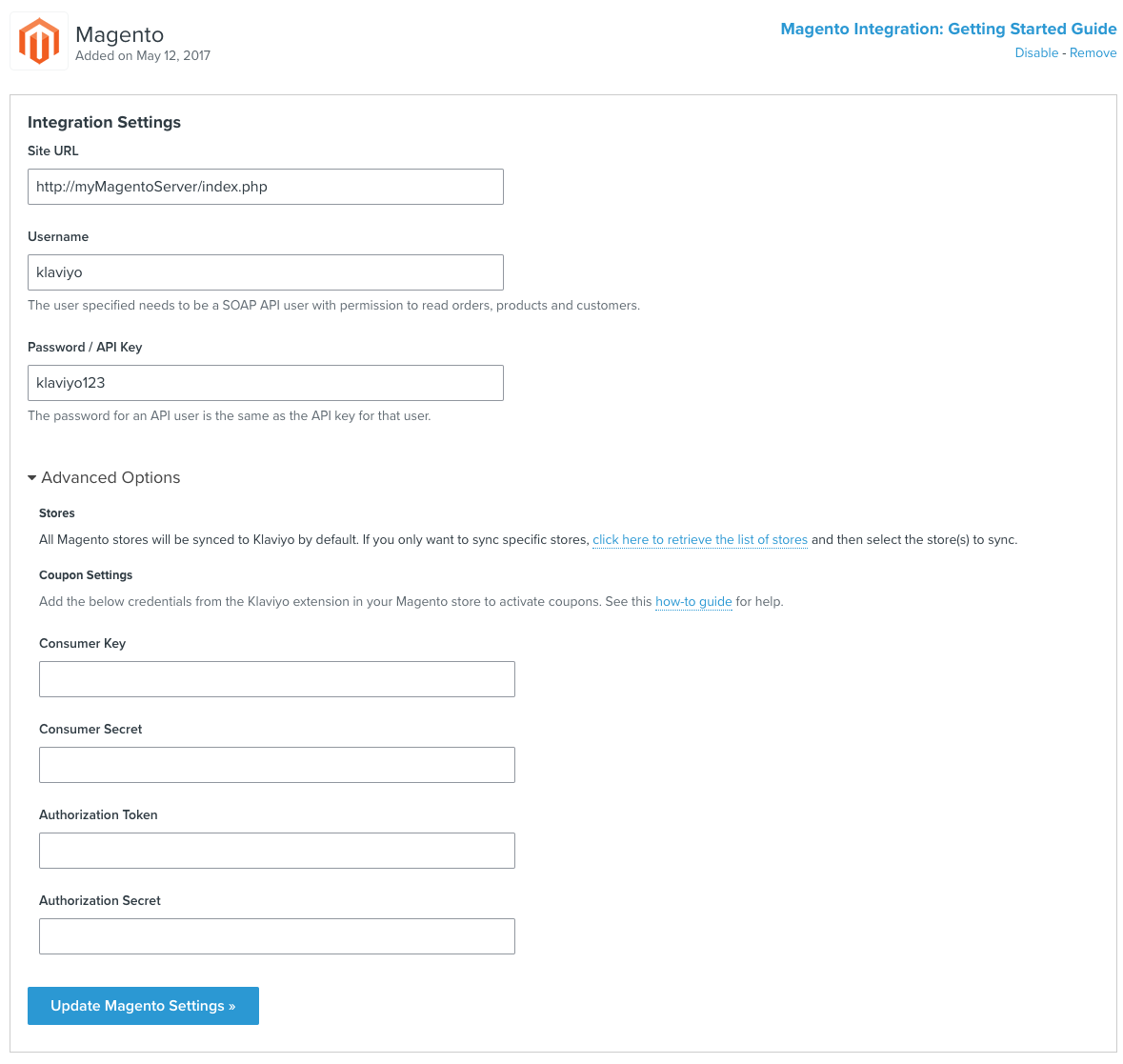 Para ativar o recurso Magento Coupons da Klaviyo, primeiro gere as credenciais da API REST da sua loja Magento usando a conta de administrador REST que você acabou de criar e, em seguida, cole-as na sua conta da Klaviyo.