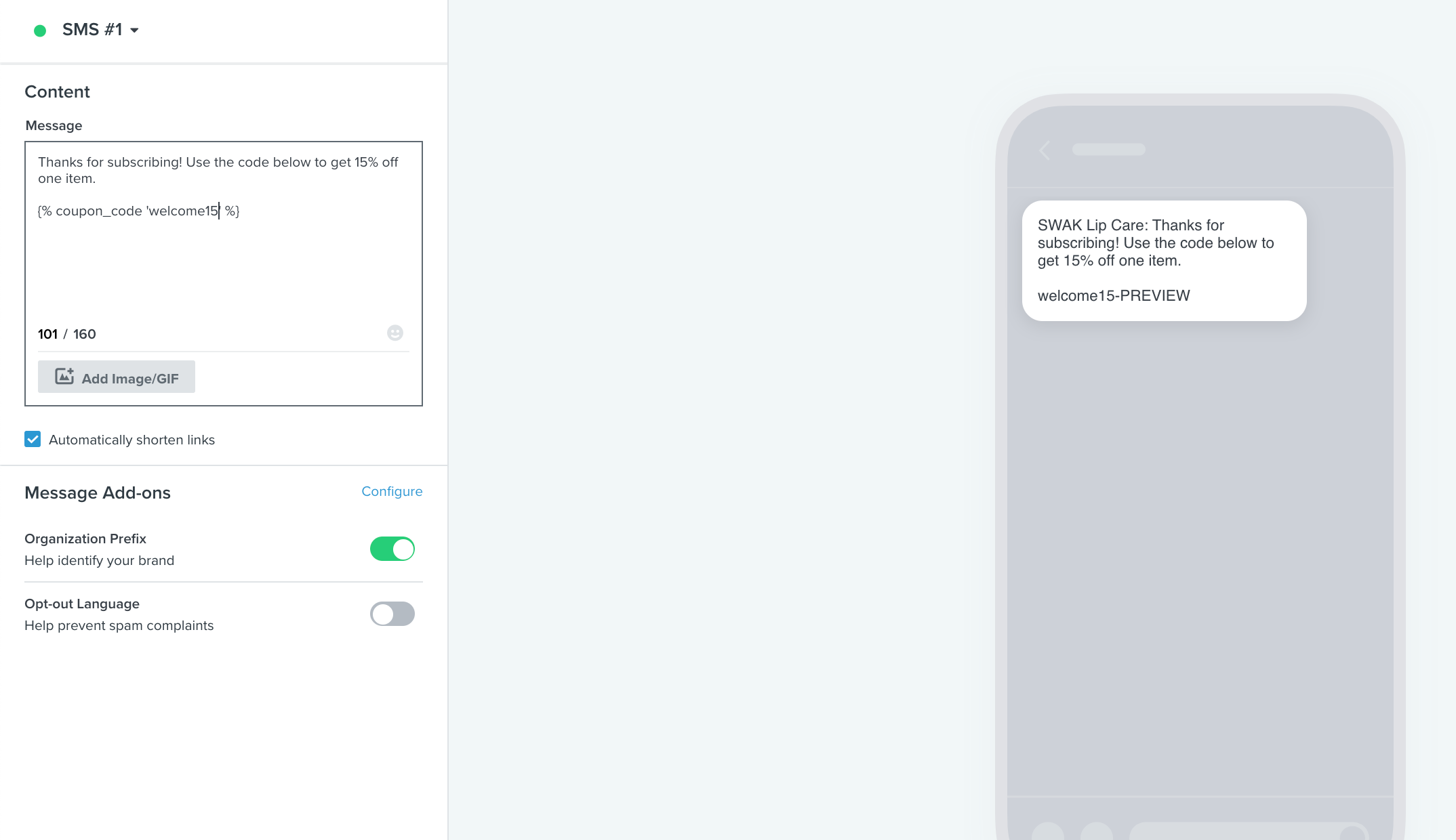cupom único também estão disponíveis para você SMS/MMS mensagens em fluxo. Gere os códigos da mesma forma que faria para o e-mail. Em seguida, use o tag de modelo abaixo para adicionar o código de cupom à sua mensagem SMS ou MMS: