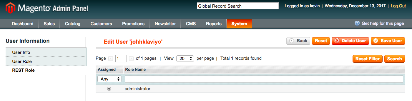 - Clique no botão de opção para atribuir a nova função de administrador REST ao seu usuário.