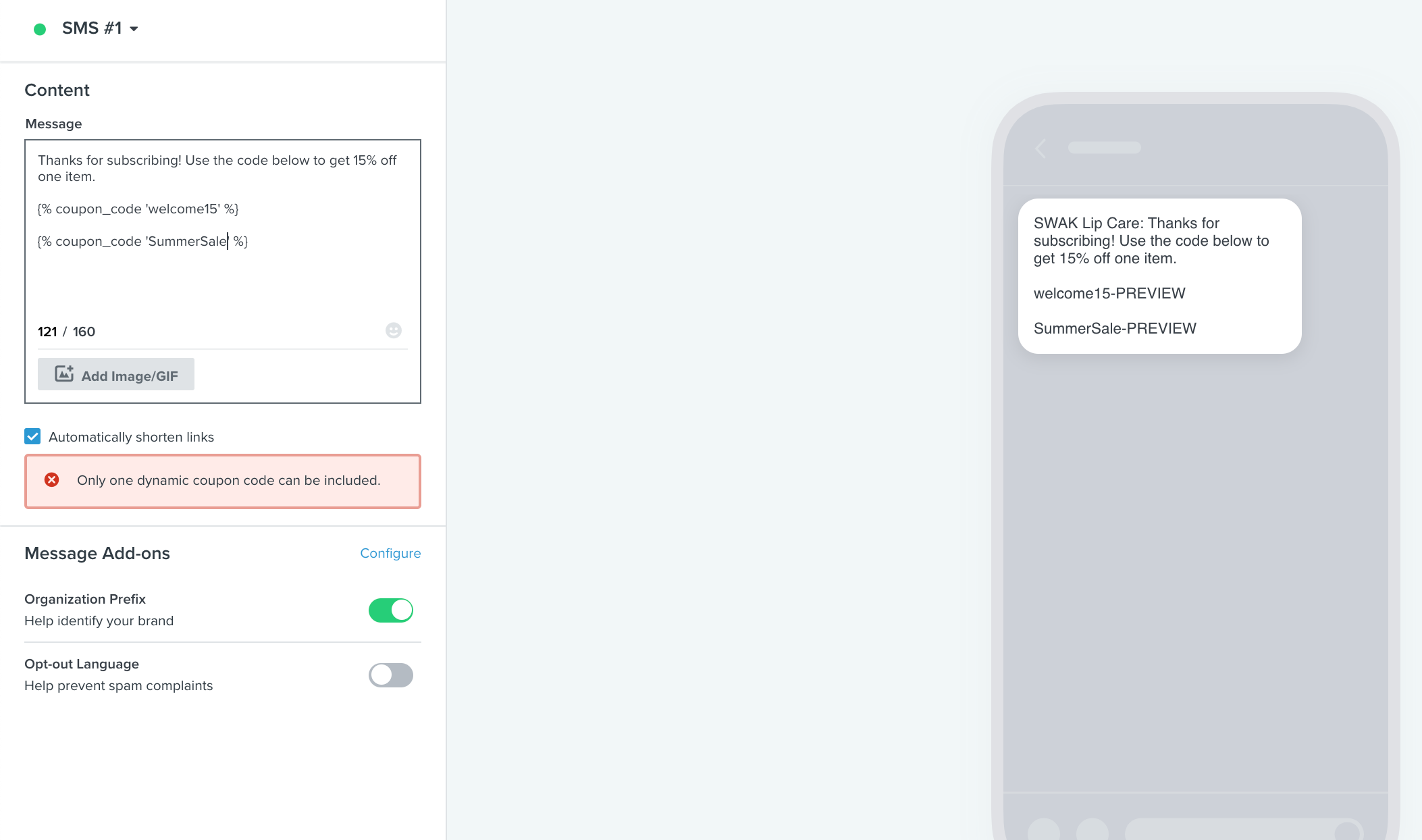 Diferentemente dos e-mails, você só pode usar um código de cupom por mensagem SMS. Com o e-mail, você tem acesso a blocos ocultos para enviar cupom diferente com base no local onde a pessoa mora ou no que ela fez. Se tentar adicionar vários cupom a uma mensagem SMS, você verá uma mensagem de erro.