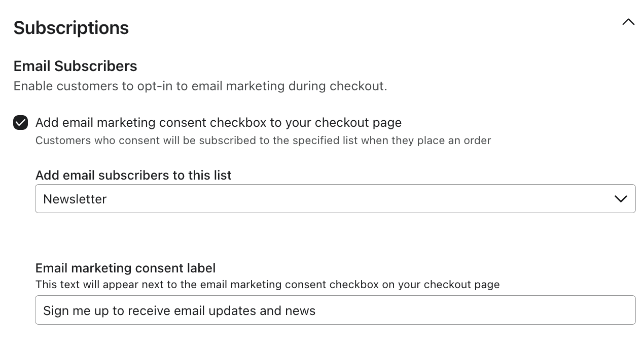 Qualquer pessoa que se inscrever por meio da caixa de seleção durante o checkout será adicionada a essa lista. O consentimento é enviado à Klaviyo depois que o cliente clica no botão enviar pedido durante a finalização da compra. - Em Etiqueta de consentimento de marketing por e-mail, digite o idioma de consentimento que deseja que apareça ao lado da caixa de seleção na página de checkout. O idioma padrão é Sign me up to receive Email updates and news.