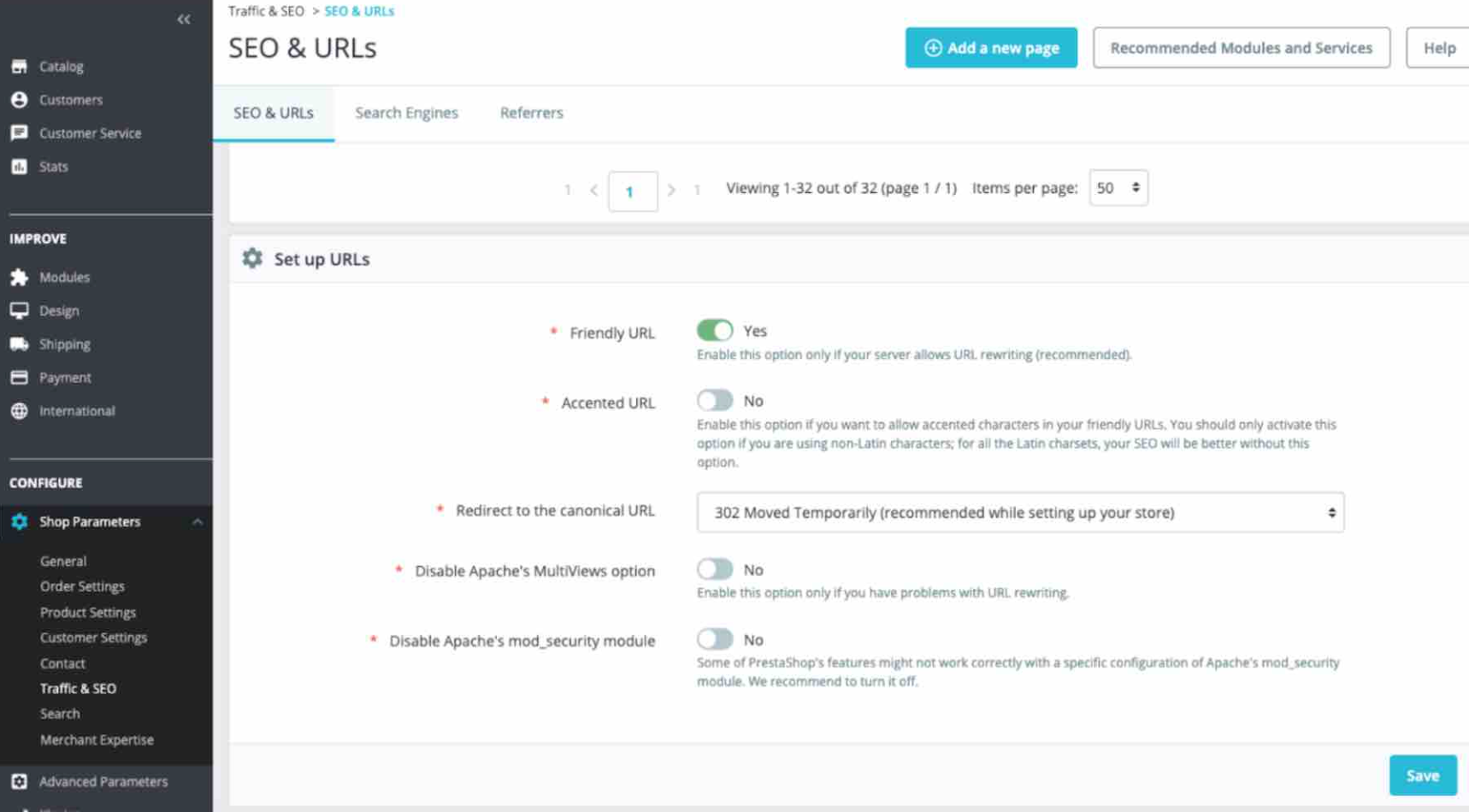 - Para gerar novamente o arquivo .htaccess, navegue até Shop Parameters > Traffic & SEO.
