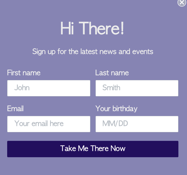 Se a colocar em outro lugar, como no canto superior esquerdo ou perto da parte inferior, os usuários poderão gastar tempo procurando uma maneira de fechar o formulário e ficarão frustrados enquanto procuram. Isso pode fazer com que eles saiam com uma impressão negativa da sua marca, o que significa que é menos provável que visitem seu site no futuro ou se tornem clientes.