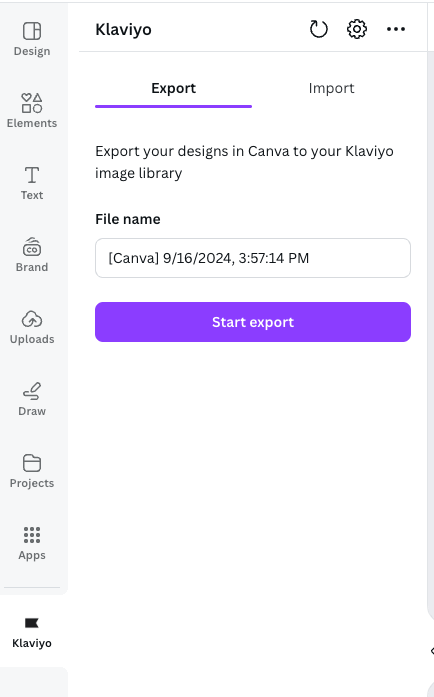 Essa integração permite a importação/exportação de imagens entre o Klaviyo e o Canva. Ele não lida com a importação/exportação de modelos de e-mail em HTML.