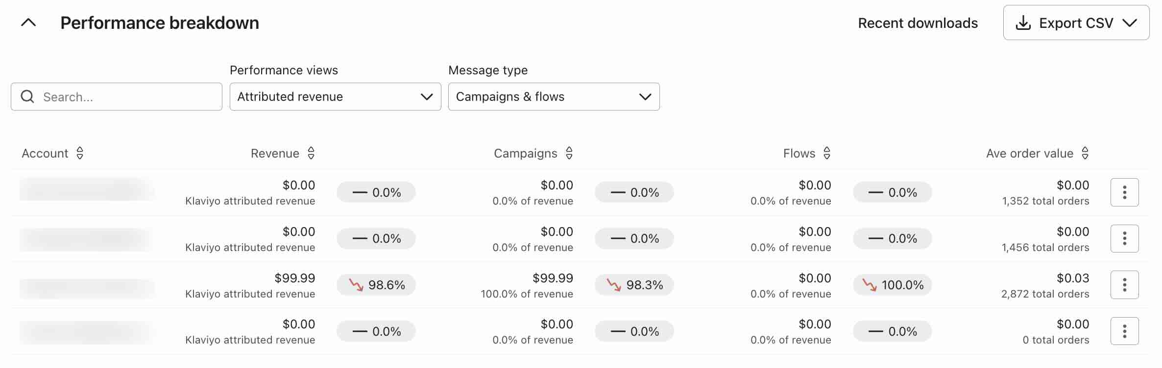 Clique em Campanha ou fluxo na navegação à esquerda. O senhor também pode selecionar uma Campanha ou um fluxo específico na página inicial > Performance breakdown para navegar até essas seções. No entanto, o senhor deve ter o filtro do gráfico de detalhamento de desempenho definido como Receita atribuída ou Desempenho da campanha com a opção Campanha ou fluxo, conforme mostrado no exemplo abaixo.