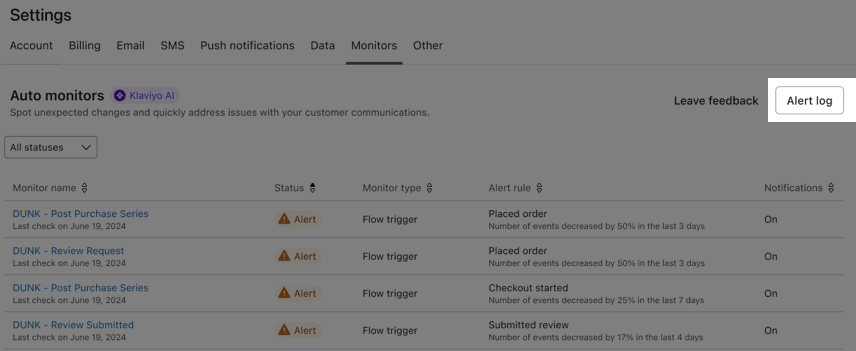 Saiba mais sobre o monitoramento automático em Klaviyo. Klaviyo Monitorar automaticamente o desempenho de sua conta em busca de anomalias com objetos-chave, como fluxo e campanhas. Isso permite que o senhor identifique e resolva rapidamente os problemas de desempenho antes que eles tenham implicações maiores.