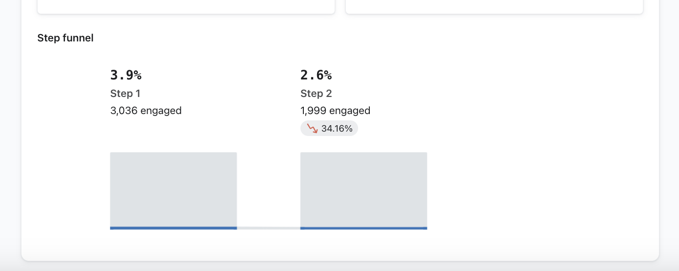 A porcentagem de declínio listada abaixo do número de usuários engajados reflete a diferença percentual na taxa de engajamento da etapa anterior. Essa métrica é calculada subtraindo os envios da etapa atual dos envios da etapa anterior e, em seguida, dividindo esse número pelos envios da etapa anterior.
