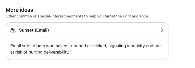 Essa definição também aparece como o segmento pré-construído Sunset (Email) na Biblioteca de segmentos, e é a mesma lógica que o site Klaviyo usa para recomendações de supressão na página de perfil suprimido.