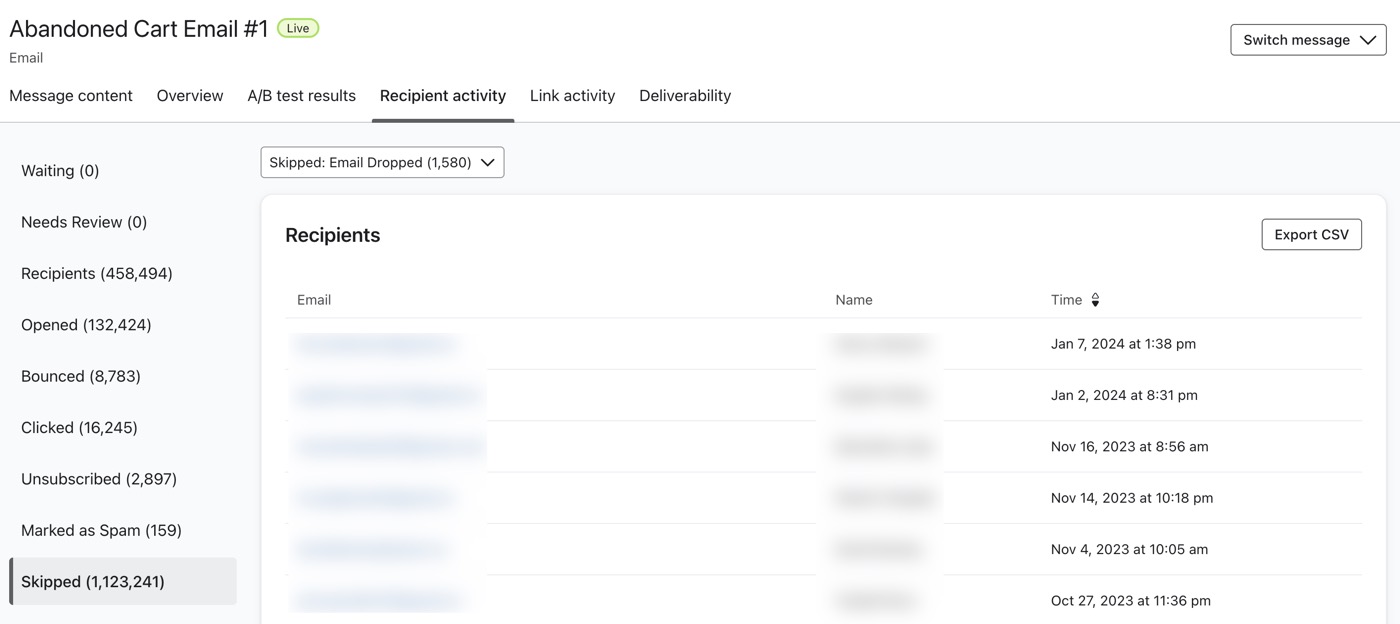 Se todas as mensagens em um fluxo estiverem definidas como rascunho, ninguém entrará no fluxo até que pelo menos uma mensagem seja definida como ativa ou manual. Quando as pessoas entram em um fluxo, se uma mensagem for definida como status de rascunho, isso não impedirá que o destinatário avance pelo fluxo. Os destinatários do fluxo ignorarão as mensagens de rascunho e passarão para a próxima etapa. Eles não serão agendados para nenhuma mensagem de rascunho nem serão exibidos na análise da mensagem. Se não houver etapas após a mensagem de rascunho, elas sairão do fluxo.