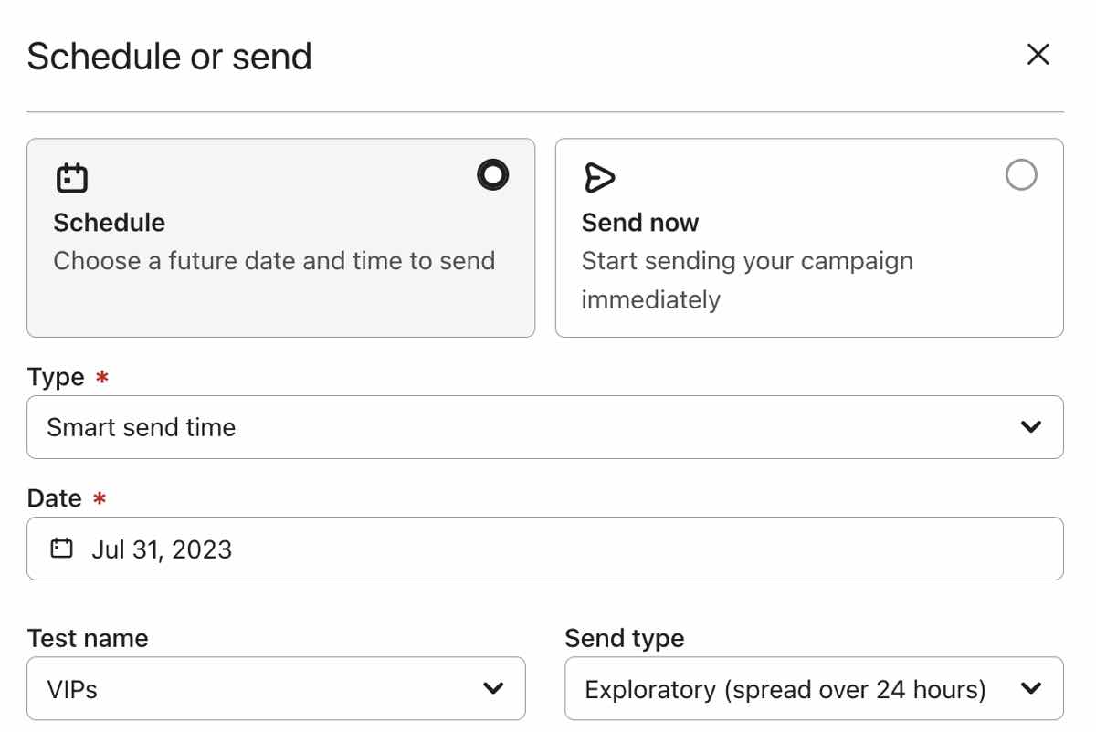 Os envios exploratórios e focados do Smart Send Time só estão disponíveis para campanhas com mais de 12.000 destinatários.