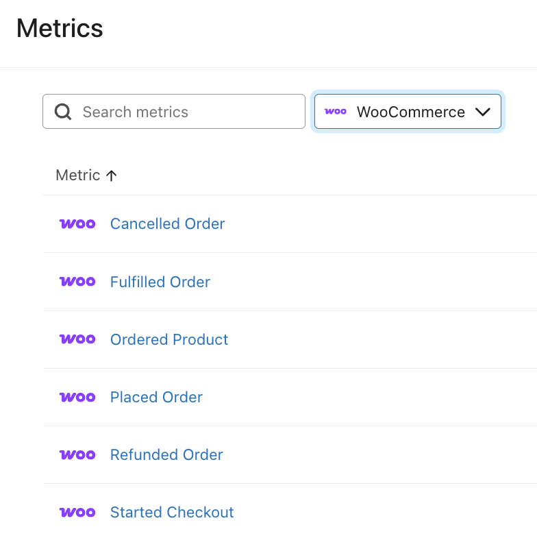 Em sua conta Klaviyo, navegue até a guia métricas e selecione métrica para ver todas as métricas em sua conta. Todas as métricas do WooCommerce terão um ícone WooCommerce, com exceção da métrica Added to Cart, que terá um ícone de engrenagem. Cada métrica é abordada individualmente abaixo.