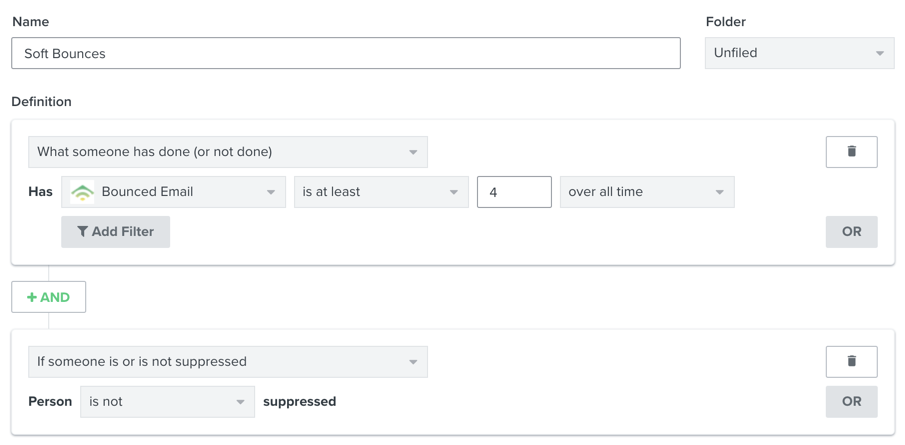 É provável que os e-mails enviados a esses assinantes continuem a sofrer soft bounces e, embora a Klaviyo suprima os perfis após sete soft bounces, o senhor pode ser proativo e limpar esses perfis não engajados antes de chegar a esse ponto.