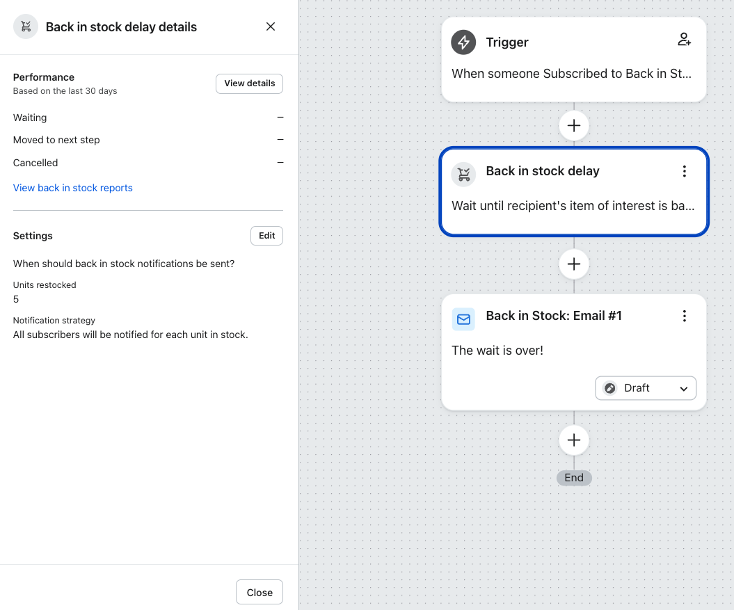 Observe que não é possível verificar se o item ainda está em estoque antes de enviar uma segunda mensagem. Depois que a mensagem inicial é enviada, o Klaviyo não pode verificar o inventário do item para ver se o item saiu do estoque novamente.