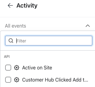 Você pode filtrar o log de atividades para exibir apenas eventos específicos que sejam relevantes para o gerenciamento dos tíquetes do Helpdesk (por exemplo, produto visualizado, checkout iniciado, pedido reembolsado etc.). Se você salvar essa visualização filtrada, ela se tornará a visualização padrão para o registro de atividades de todos os tickets do Helpdesk.