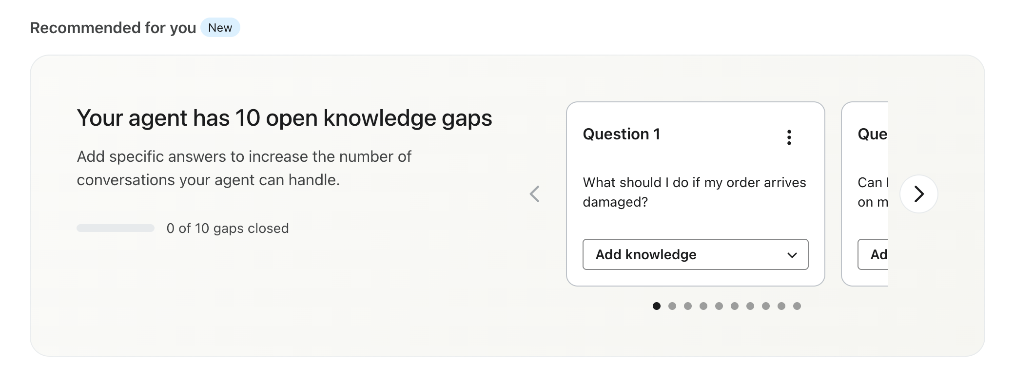 Na parte superior do painel, você encontrará o cartão de lacunas de conhecimento. Esse recurso ajuda você a melhorar a eficácia do seu agente, executando um conjunto das perguntas mais comuns dos clientes em relação à sua base de conhecimento conectada para identificar as lacunas existentes.