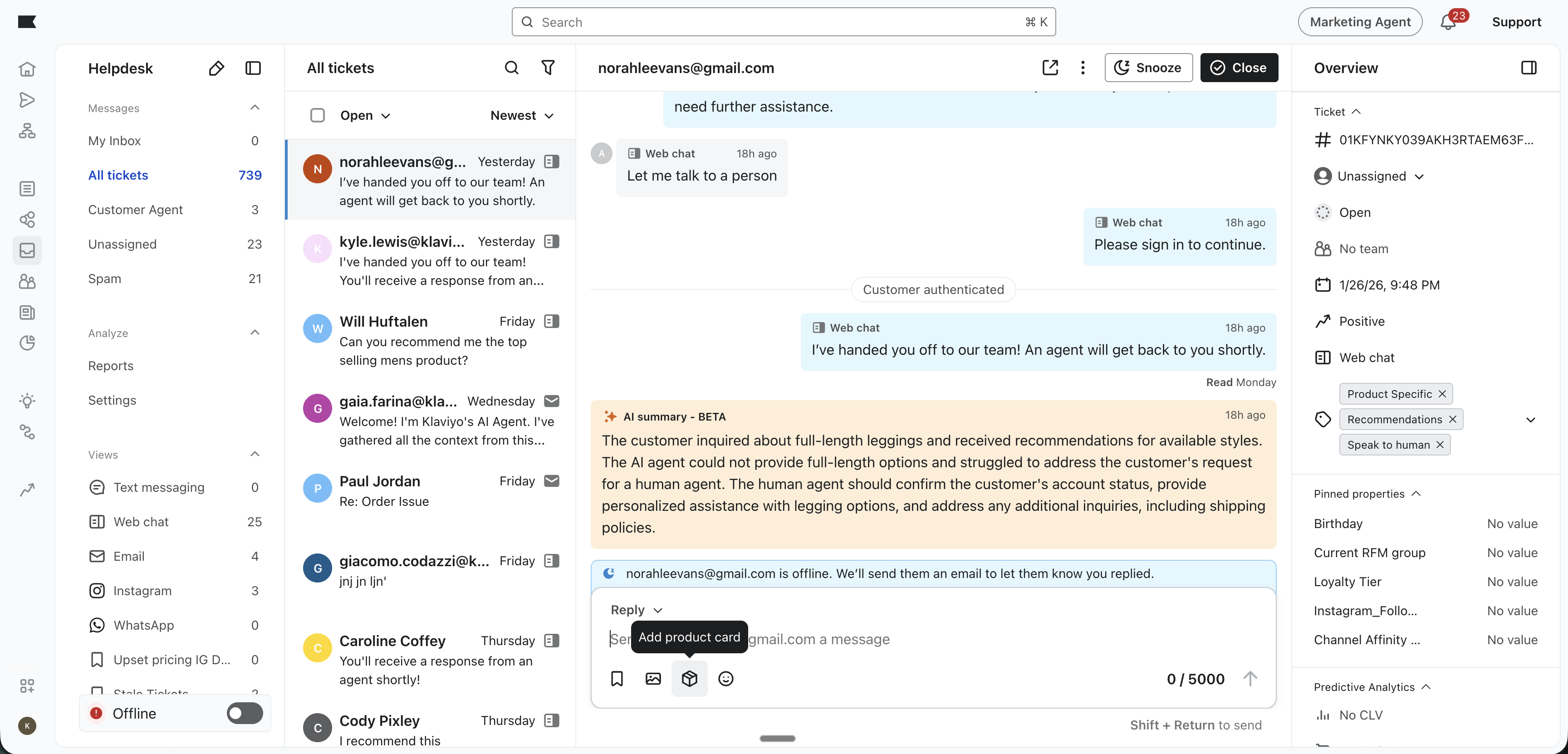 As recomendações de produtos permitem que você sugira itens sem que o cliente precise alternar entre guias ou procurar links. Esse recurso está disponível para todas as conversas em Helpdesk, independentemente do canal que o cliente estiver usando.