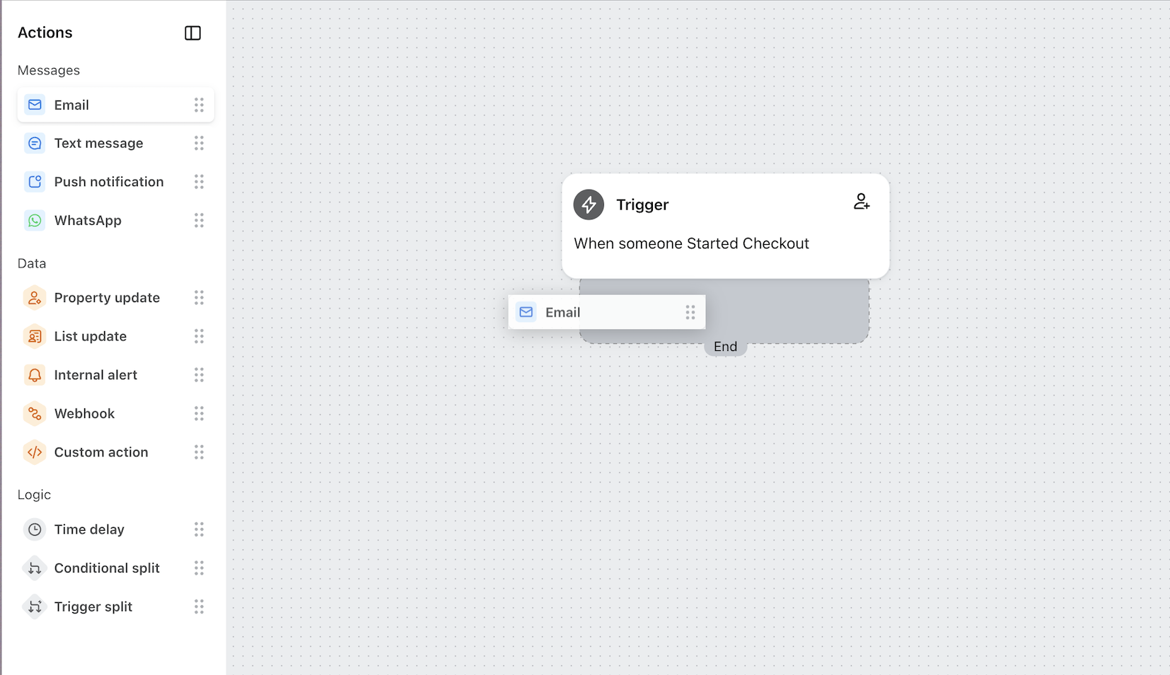 Du kan klicka på ”+”-knapparna som finns vid varje nod där en åtgärd kan läggas till. Om du klickar på ”+” öppnas en meny där du kan välja en åtgärd för att lägga till den direkt på din canvas (dessa åtgärder motsvarar samma åtgärder som finns i sidofältet).