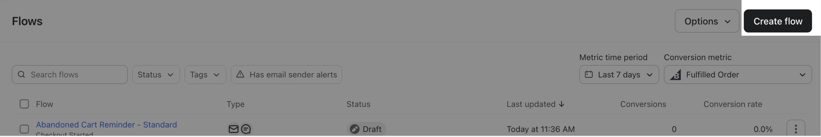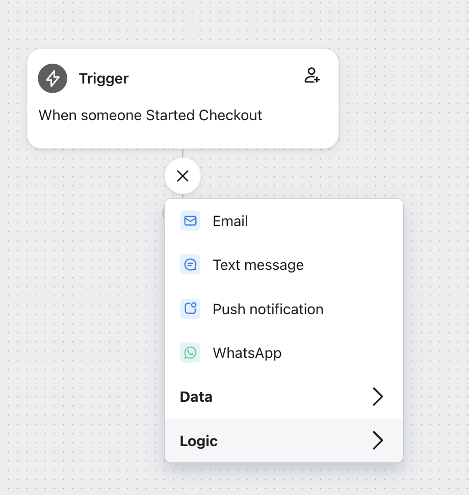 - Övergiven kundvagn: ett övergiven kundvagn-flöde konverterar potentiella kunder. Detta flöde är anpassningsbart baserat på artiklar i någons kundvagn och om de redan är en kund.