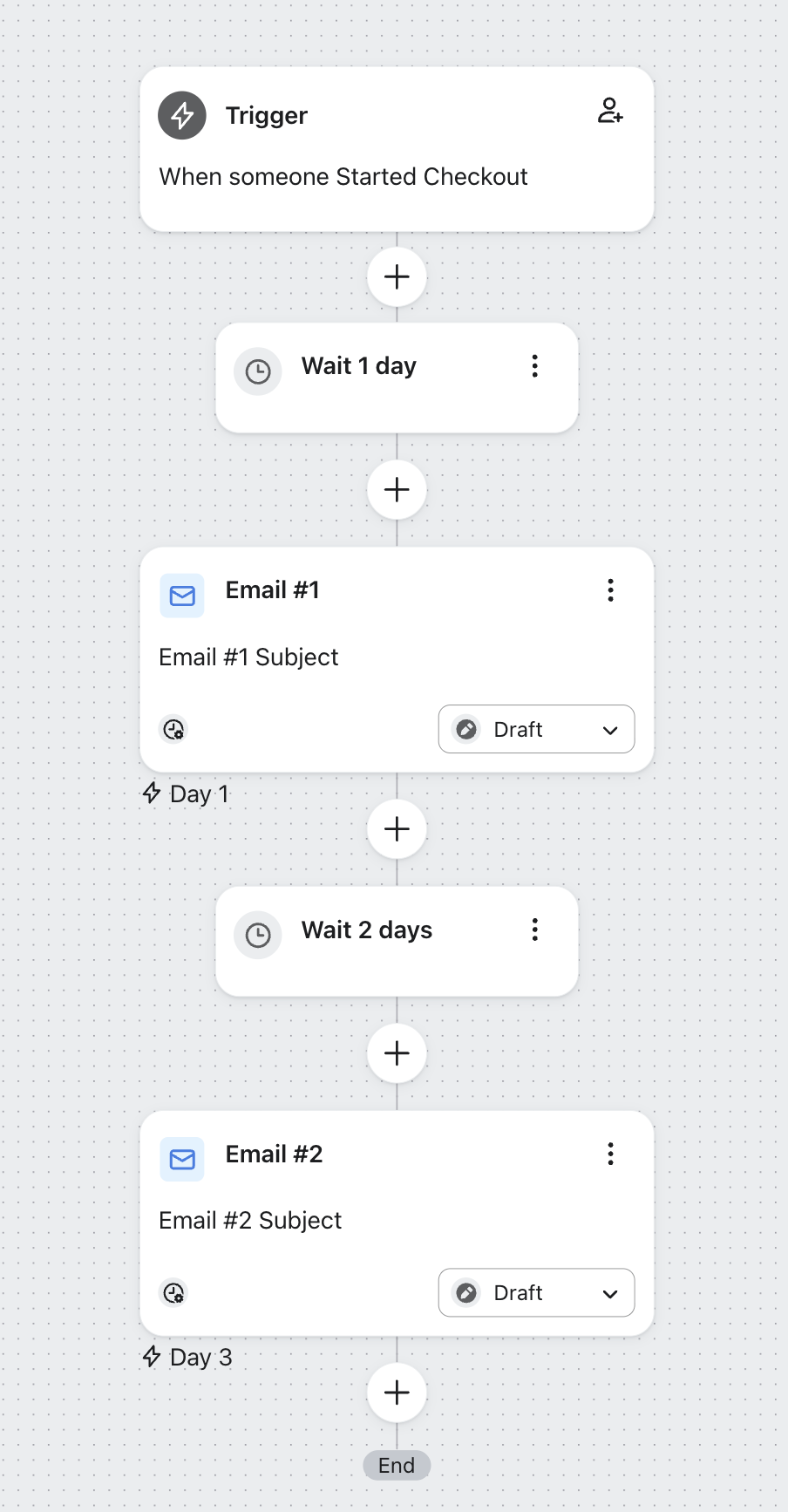 Det innebär att om "E-post #1" i ett flöde skickas en dag efter utlösaren, och du lägger in en tidsfördröjning på 2 dagar mellan det första och det andra e-postmeddelandet, kommer "E-post #2" att skickas 3 dagar efter utlösaren.
