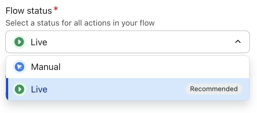 Det finns 3 möjliga statusar för ett helt flöde eller enskilda flödesåtgärder: utkast, manuellt eller aktivt.
