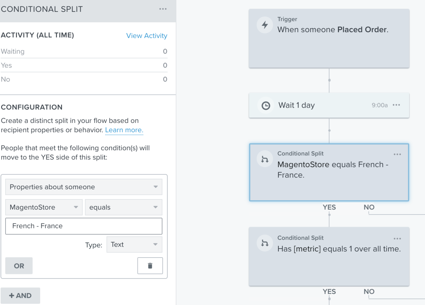 Du kanske vill ställa in olika meddelanden för flera Magento butiker. Om du till exempel support flera språk i din Magento butik, kanske du vill skapa en efter köp flöde och med olika flöde grenar för din fransktalande butik och för din engelsktalande butik. Du kan åstadkomma detta genom att skapa en villkorsstyrd delning baserad på MagentoStore profilegenskaper.