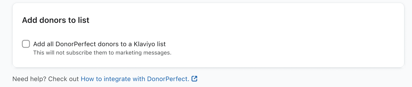- På nästa sida väljer du Lägg till alla DonorPerfect-donatorer i en Klaviyo-lista och väljer sedan en lista i rullgardinsmenyn som visas.