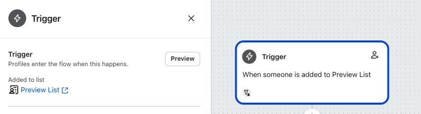 - Se den översta delen av sidofältet för detaljer för att se om flödet utlöses av en lista eller ett segment och namnet på listan eller segmentet.