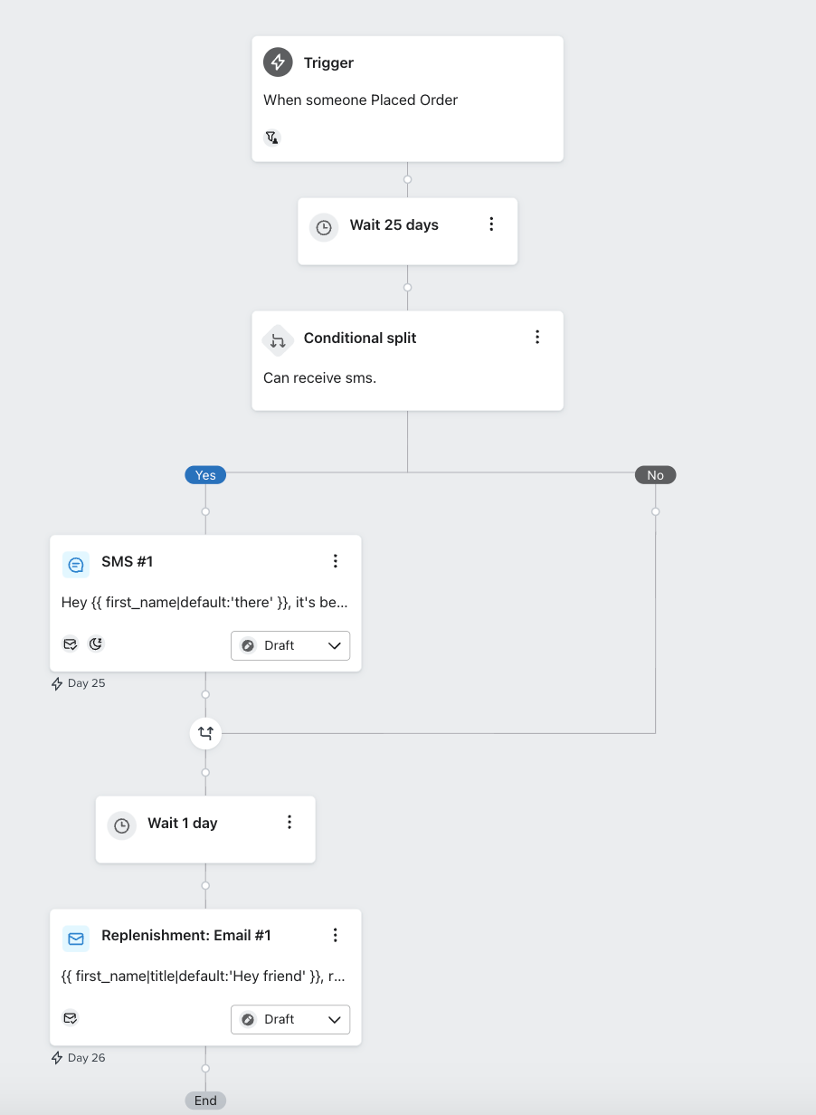 Timing är den viktigaste delen av påfyllningsflödet. Nyckeln är att påminna prenumeranterna när de har slut på produkten, men inte helt slut. De fungerar också bättre om du avsätter tid för att produkten ska kunna skickas och levereras. Om köpcykeln är 30 dagar kan det till exempel vara bra att skicka meddelandet efter cirka 20 dagar. -