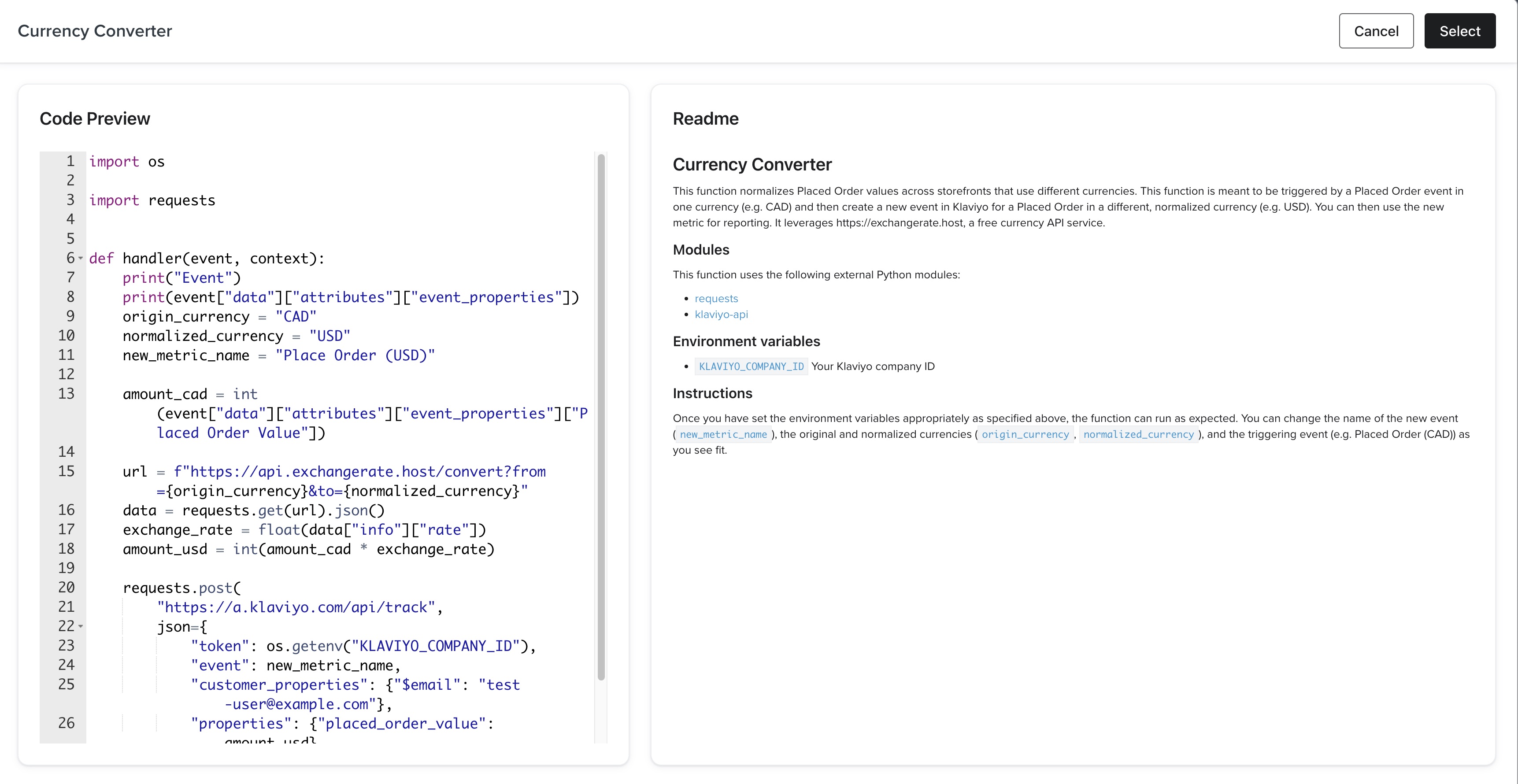 Python-koden för den här lösningen skrivs i kodredigeraren och körs direkt av Klaviyo.