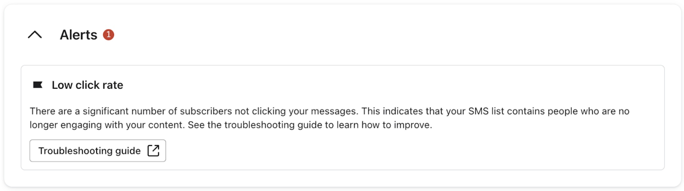 Avsnittet Varningar är ett hopfällbart kort som visas när ett problem med sms leveransbarhet har identifierats på ditt Konto. Varje varning indikerar att en viktig leveransbarhet mättal upplever dålig prestanda och ger information om problemet med en länk till en felsökningsguide för att lösa problemet.