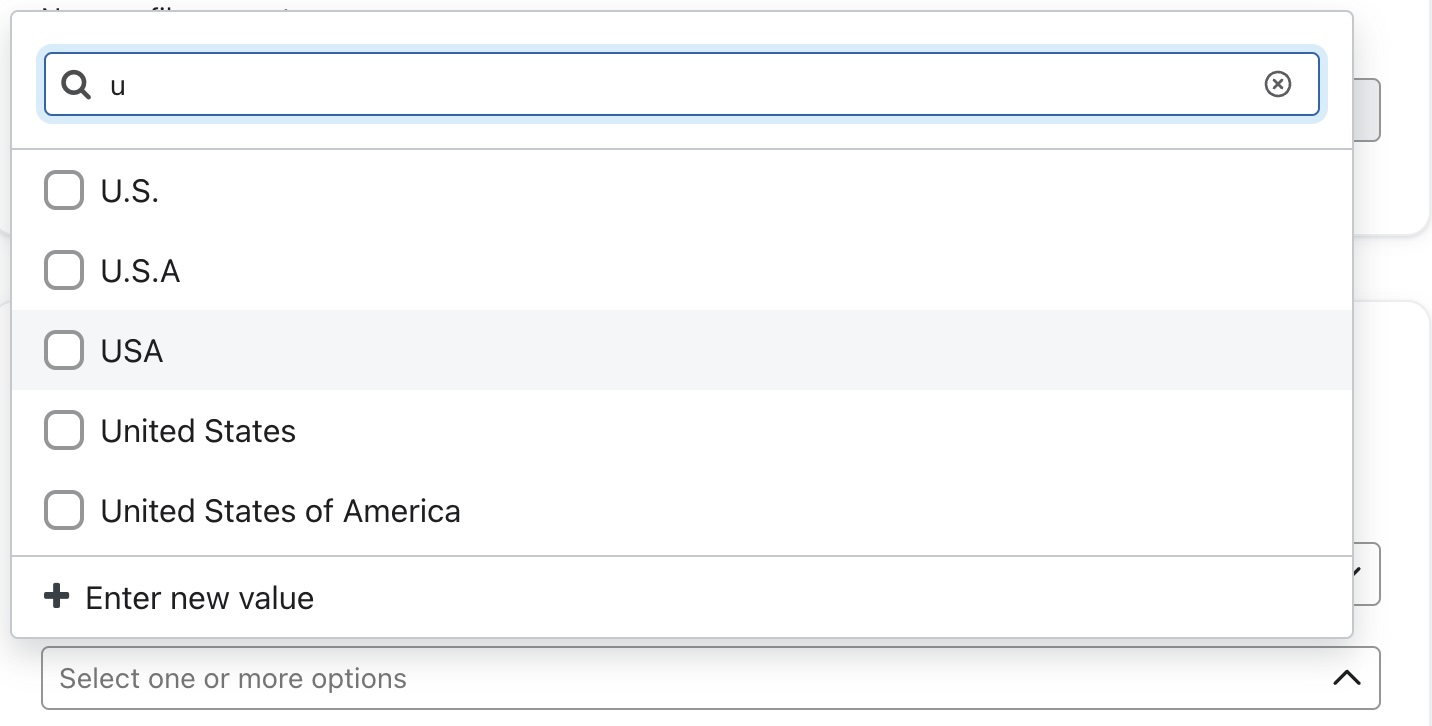 - Ange önskade värden som ska ersättas i villkoret If value. Du kommer att se en rullgardinsmeny som visar upp till 512 unika värden som finns på din Konto för den egendom som omvandlas. Du kan inkludera upp till 30 värden i ett villkor eller skapa ett nytt värde genom att välja alternativet Ange nytt värde i rullgardinsmenyn.