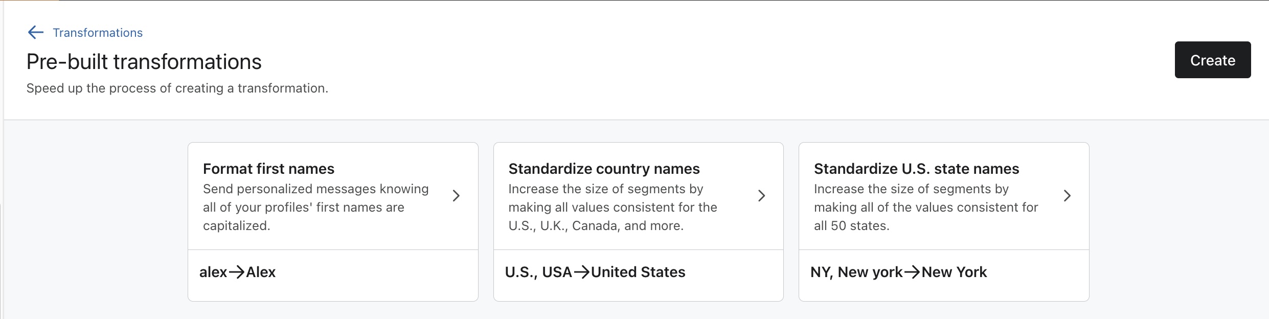För att implementera en färdigbyggd transformation, navigera till Advanced Klaviyo Data Platform > data management > Transformation. Om detta är din första omvandling kommer du omedelbart att se de färdigbyggda omvandlingarna på sidan. Om du redan har tidigare transformationer väljer du Create.