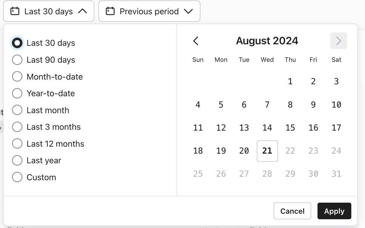Detta alternativ jämför dina data med samma tidigare datumintervall. Om du t.ex. väljer alternativet Previous year och ställer in din tidsperiod till Last 30 days, kommer instrumentpanelen att jämföra din data med motsvarande 30 dagar från föregående år. Om du väljer Previous period kommer din data att jämföras med samma tidigare datumintervall eller, i det här fallet, de senaste 30 dagarna med vårt valda intervall data.
