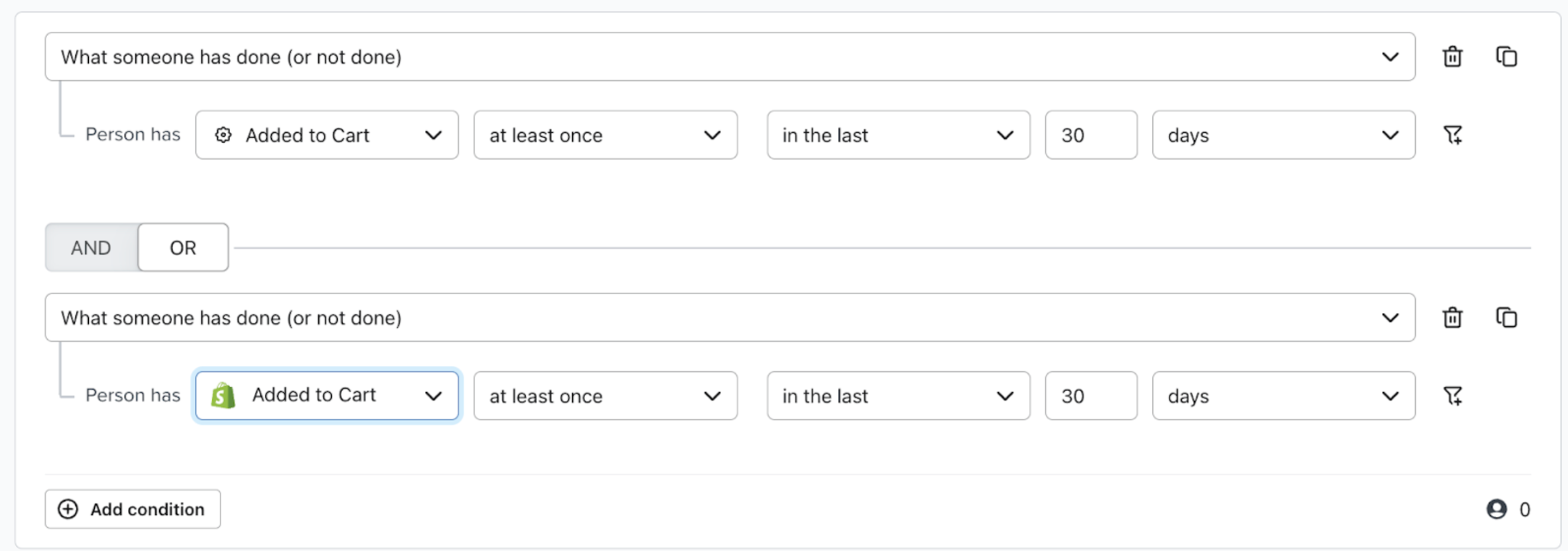 - Redigera varje segment, lägg till en OR-klausul som speglar ditt original men använder Shopify-märket Added to Cart mättal. Till exempel inkluderar segment nedan de som lagt till i varukorgen minst en gång under de senaste 30 dagarna, spårat av antingen mättal. Om dina villkor är helt negativa, använd en AND-klausul.