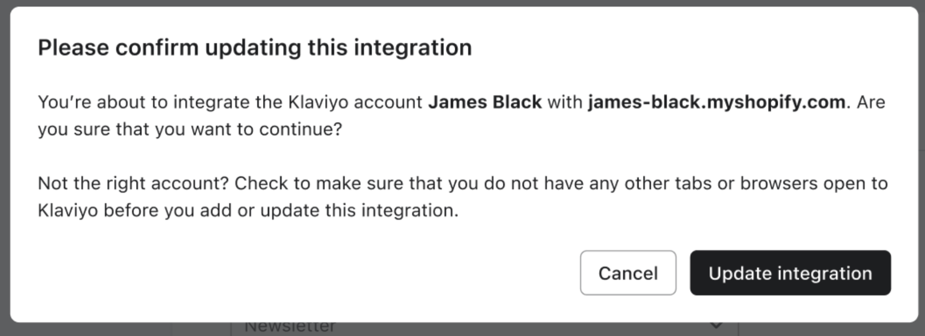 - I bekräftelsemodalen väljer du uppdatera integrationer.