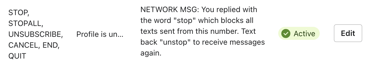 - Rekommenderas för: prenumerationsföretag för ord som "avbeställa", "avsluta prenumeration", "avsluta" och "sluta". (kund kan skicka dessa när man diskuterar själva abonnemanget snarare än deras sms-samtycke. )
