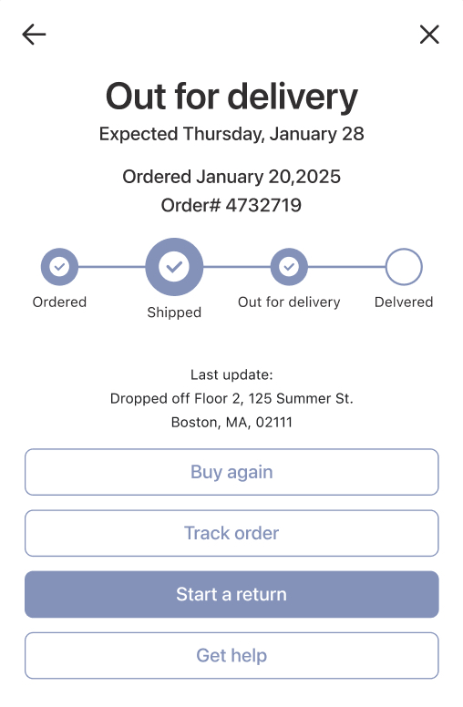 När en beställning har levererats visas knappen ”Starta en retur” i beställningsinformationen. Kundens upplevelse när de klickar på den här knappen beror på vilken returleverantör du ansluter: