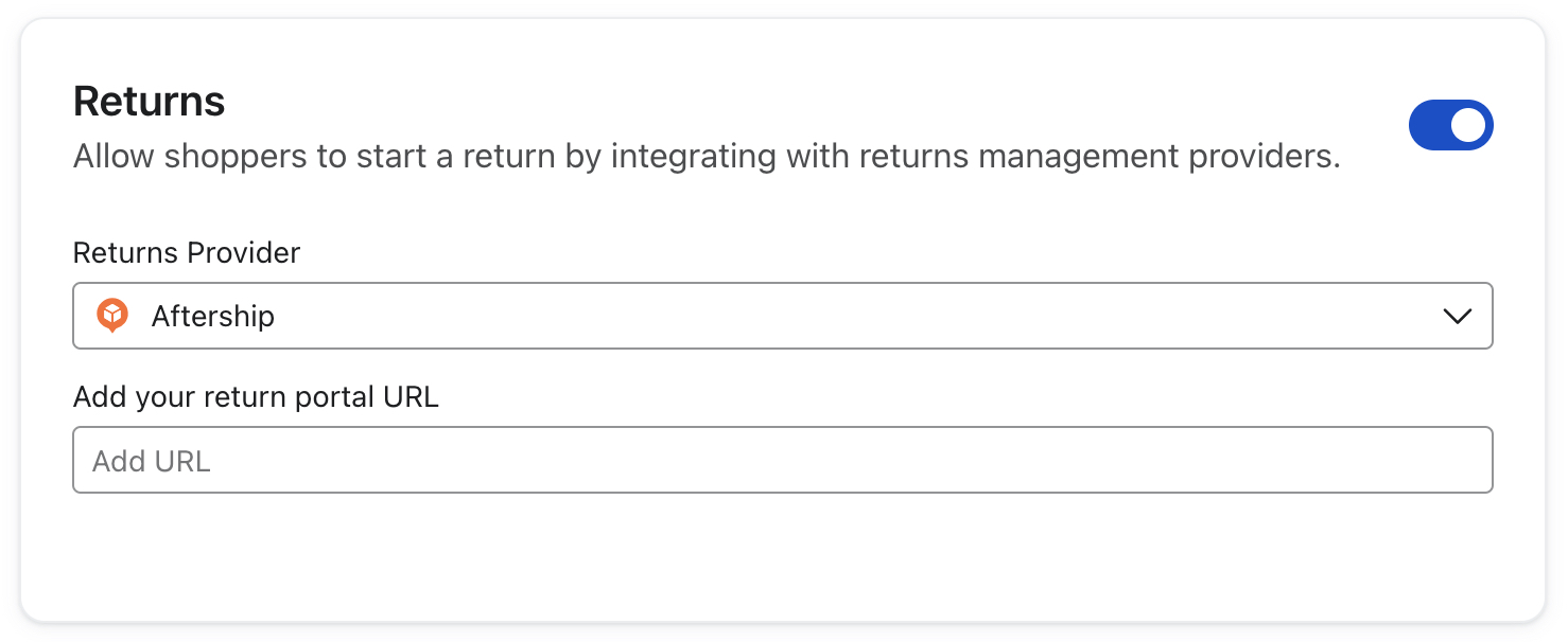 - Under Returer aktiverar du inställningen och väljer sedan din leverantör (AfterShip, Parcel Lab, Narvar eller Annat).