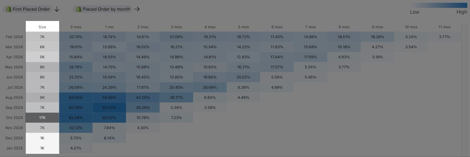 I exemplet med kohortrapporten kan du se att konverteringarna i allmänhet ökar ju längre ner i kolumnen du kommer. Om du tittar på kolumnen 1 mos (dvs. 1 månad) kan du se att antalet konverteringar ökar för nyare kohorter. Detta kan tyda på att det mot slutet av 2024 kan ha inträffat en händelse (t.ex. lansering av en ny produkt eller en marknadsföringskampanj) som drev denna ökning. För kohorten augusti 2024 noterades en kraftig ökning av antalet profiler som gjorde ett ytterligare köp månaden efter sitt första köp (dvs. 56,9% av den första kohorten jämfört med 24,29% för kohorten juli 2024 vid samma relativa tidpunkt i deras livscykel).